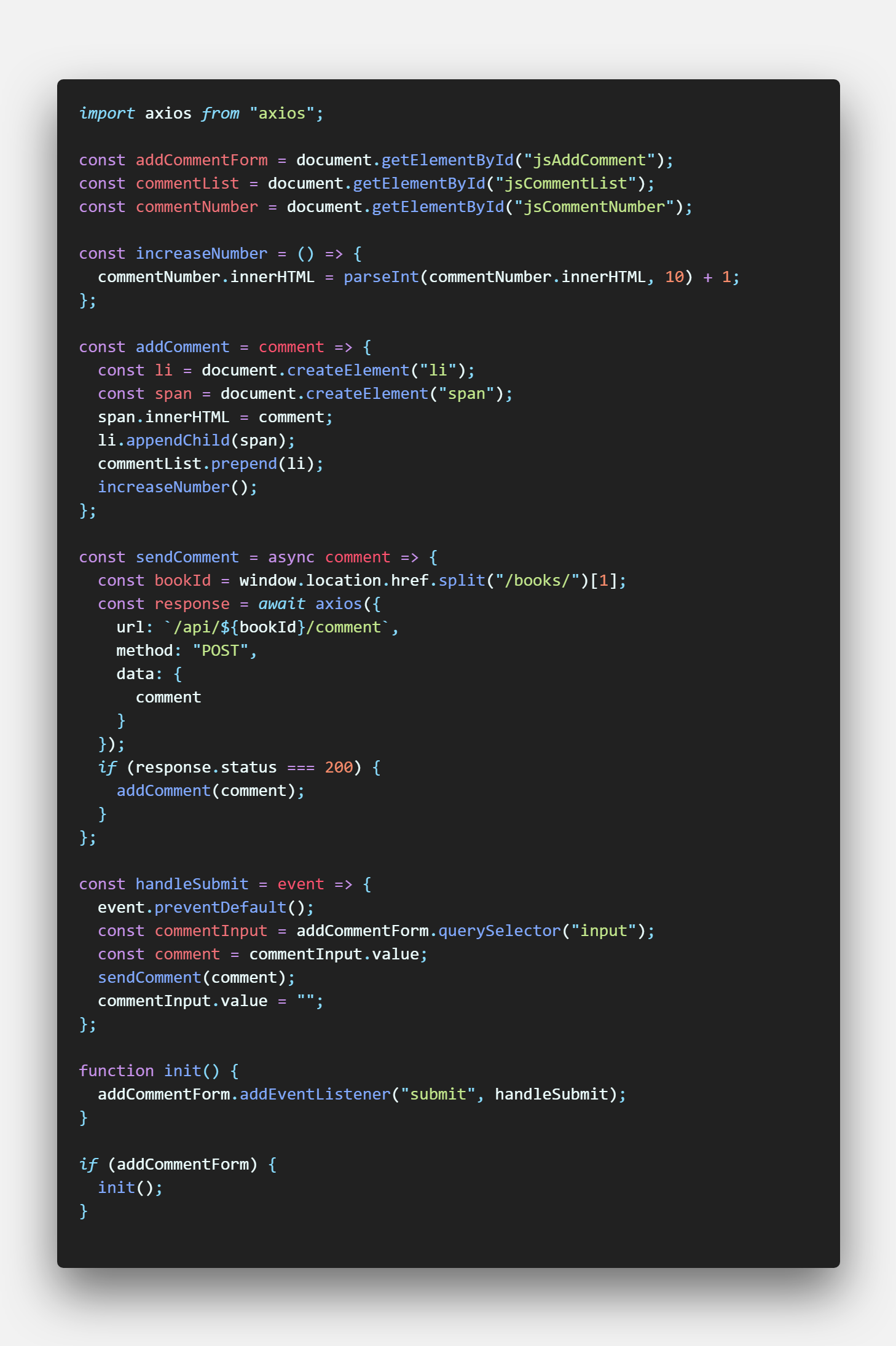 - 그리고 assets/js/addComments에서 getElementById 함수를 이용해 이들을 관리한다.