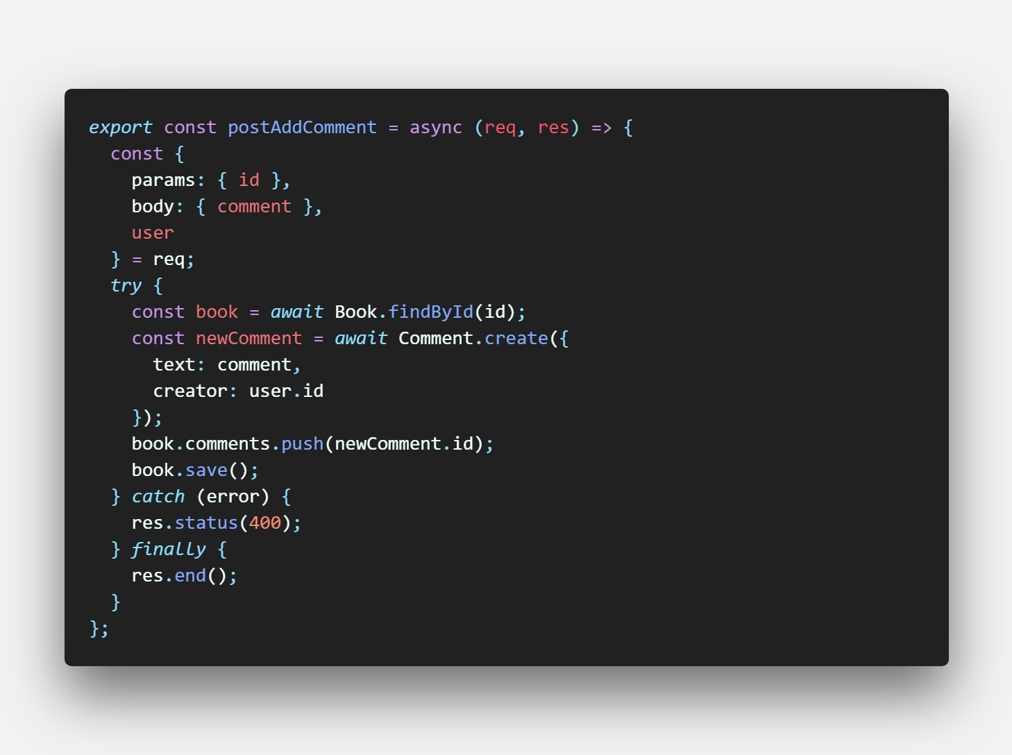 - postAddComment 함수는 Book model의 comment에 새로 입력된 comment를 추가한다.