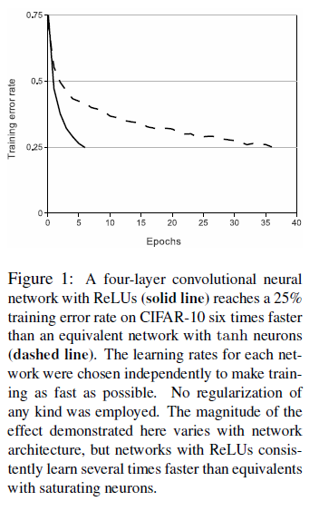 일반적으로 뉴런의 출력은 시그모이드 함수나 tanh함수로 구한다. 학습하는 시간의 관점에서 기울기 감소를 봤을 때, 이러한 포화하는 비선형 함수(saturating linearities)는 비포화 비선형 함수(non-saturating linearity)인 ReLU보다 훨씬 느리다. ReLU를 사용한 깊은 합성곱 신경망은 tanh 함수를 사용했을 떄보다 더 빨리 학습한다. (Figure 1) 이 결과를 봤을 때, 전통적인 포화 비선형 함수는 큰 규모의 신경망을 학습시키지 못할수도 있다.